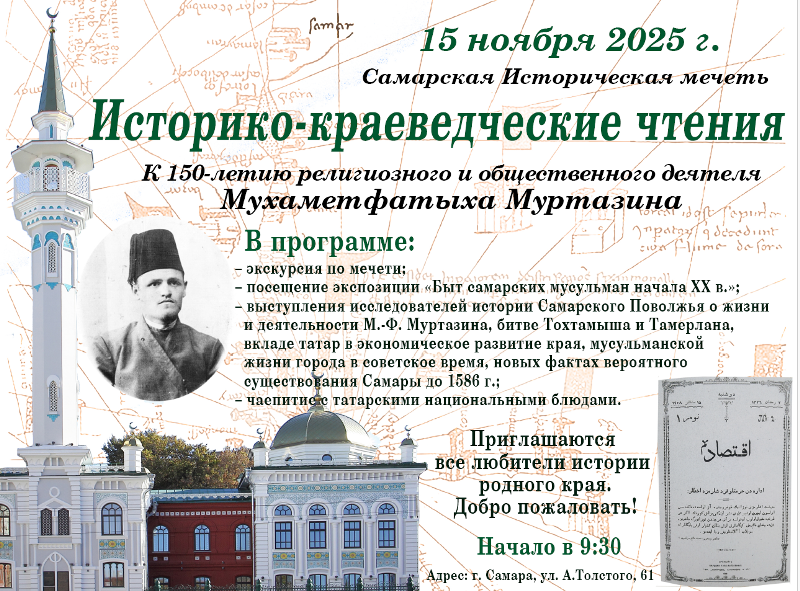 15 ноября 2025 г. в Самарской Исторической мечети (ул. Алексея Толстого, 61) состоятся историко-краеведческие чтения, посвященные 150-летию религиозного и общественного деятеля Мухаметфатыха Муртазина. Начало мероприятия в 9.30, регистрация участников – с 09.00.
